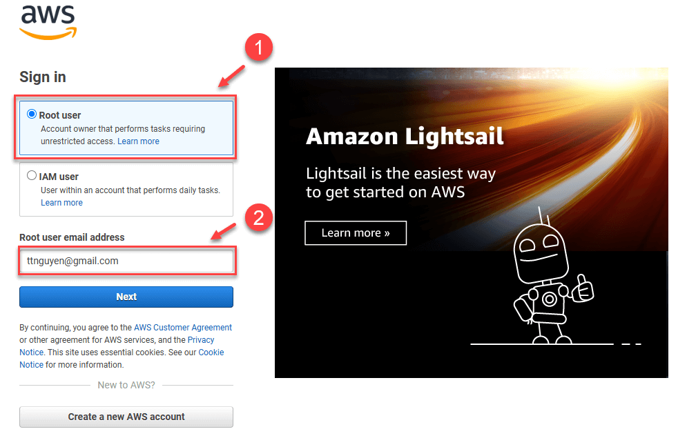 - Đăng nhập bằng Root account (tài khoản chính, không phải IAM User).