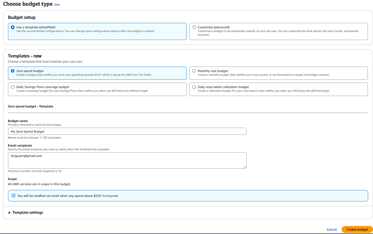 - Zero spend budget: Ngân sách này giúp bạn nhận thông báo ngay khi có chi phí vượt quá 0,01 USD. Mẫu này rất hữu ích để đảm bảo bạn không vượt quá giới hạn sử dụng miễn phí (AWS Free Tier).
